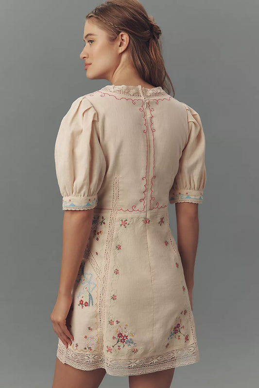 Linen Blend Puff-Sleeve V-Neck Mini Dress
