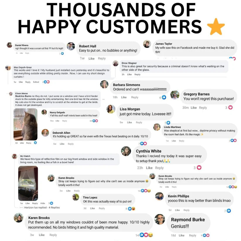 Say goodbye to prying eyes and unwanted attention with Privacy Window Film by HorizonLux™. Designed with a frosted finish, it blocks views from the outside, keeping your space secure and private. With reinforced glass, it minimizes the risk of shattering, ensuring safety for you and your family. Our reflective film provides 24/7 privacy, offering constant peace of mind - day or night, unlike regular window coverings that fail after dark!